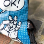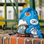 Designet med en robot og en taleboble med teksten 'OK!' giver posen et unikt look til børn.
