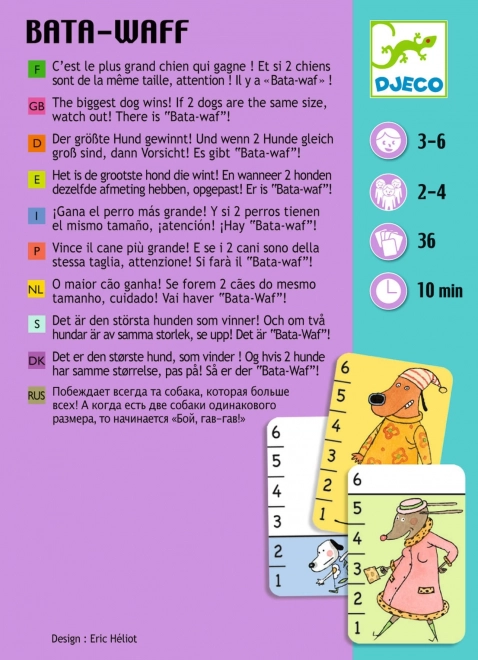 Spillet DJECO Bata-Waf er et fængende og let kortspil, der lærer børn at sammenligne størrelser og samtidig træner reaktionsevnen. Hver spiller vender sit øverste kort, og den, der har den største hund på kortet, tager alle de viste kort. Hvis størrelsen er den samme, lyder det magiske “Bata Waf”, og der følger en omspil med endnu et kort.