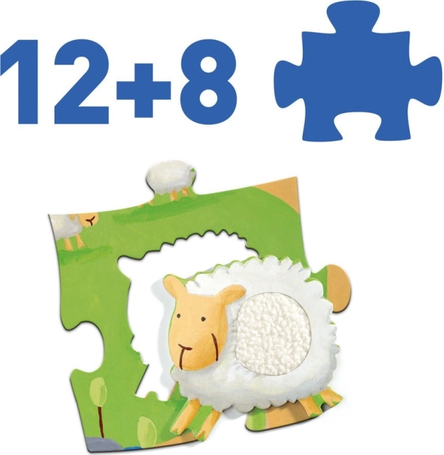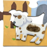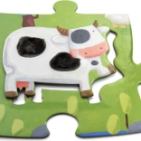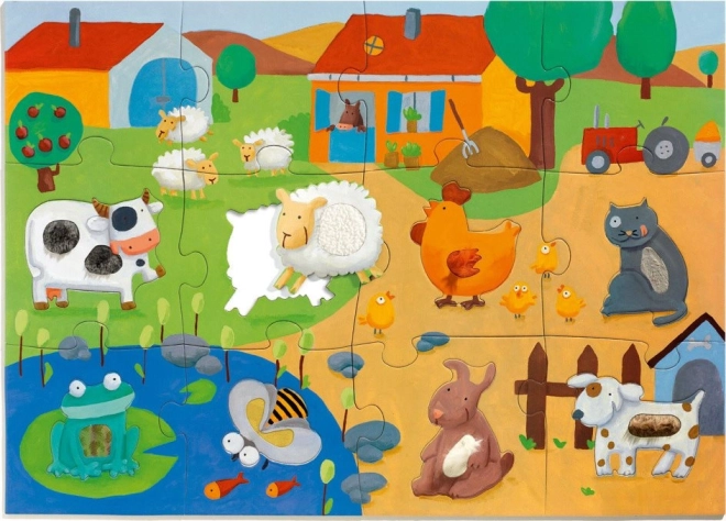 Motivet består af 12 store brikker og 8 indsatsbrikker formet som dyr med forskellige teksturer. Takket være det store format (ca. 70 × 50 cm) kan puslespillet nemt lægges på gulvet og passer også godt til små hænder.