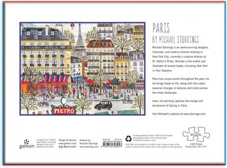 Oplev magien ved Paris med disse smukke puslespil på 1000 brikker fra den anerkendte kunstner Michael Storrings. Fremstillet af genbrugsmaterialer, støvbeskyttet og med tryk i høj kvalitet.