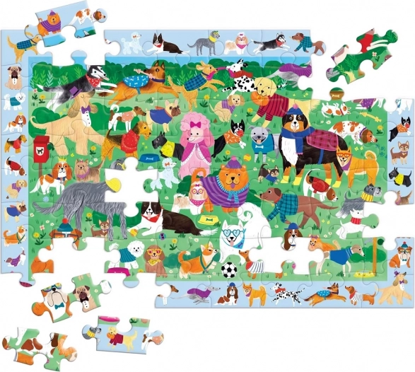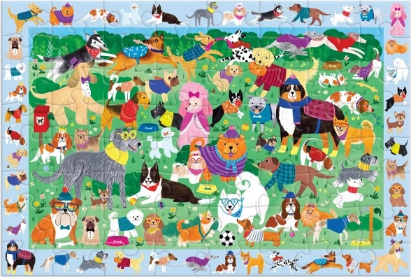 Mudpuppy Byg og find: Hundedag kombinerer klogt puslespilssamling og en findeleg, som udvikler iagttagelsesevne, tålmodighed og finmotorik. Når scenen fuld af hunde er lagt, kan børn lede efter mere end 40 skjulte figurer i rammen omkring billedet – ideel underholdning for børn fra 4 år.