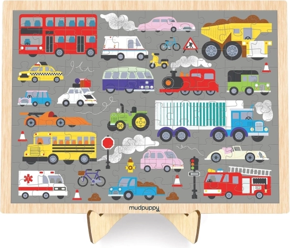 Oplev leg og læring med MUDPUPPYs træpuslespil med temaet transportmidler. Sættet indeholder 100 solide træbrikker med smukke illustrationer af biler, lastbiler, busser og mere samt en praktisk træstander til at udstille det færdige billede som dekoration.
