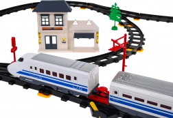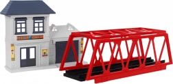 Sættet inkluderer lokomotiver, vogne, banegård, en bro og dekorative elementer som træer og trafikskilte. Dette legetøj giver en interaktiv og kreativ oplevelse for både børn og forældre.