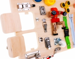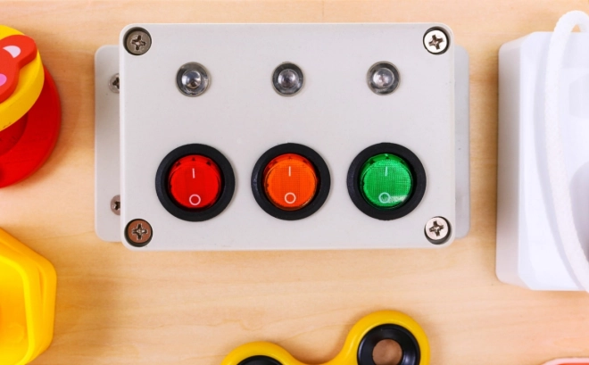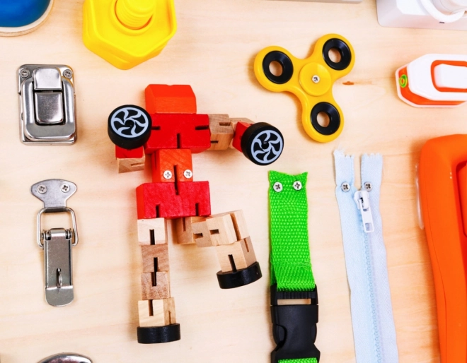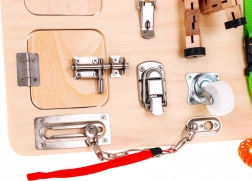 Tavlen indeholder en række interaktive elementer som låse, kontakter og returmekanismer, der støtter forbedring af finmotorikken og lærer børn om årsagssammenhænge.