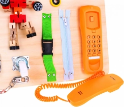 Tavlen rummer forskellige legeelementer som spinner, telefon og klokke. Disse elementer gør læring til en leg, som børn vil elske.