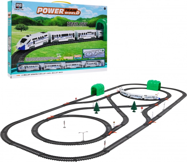 Dette fantastiske togsæt indeholder 70 dele og kan skabe et spor på op til 900 cm. Delene er designet til at blive samlet let og sikkert, hvilket sikrer lang holdbarhed og robusthed. Lokomotivet har lyseffekter (rød diode på fronten) og tilbyder to hastighedstilstande.