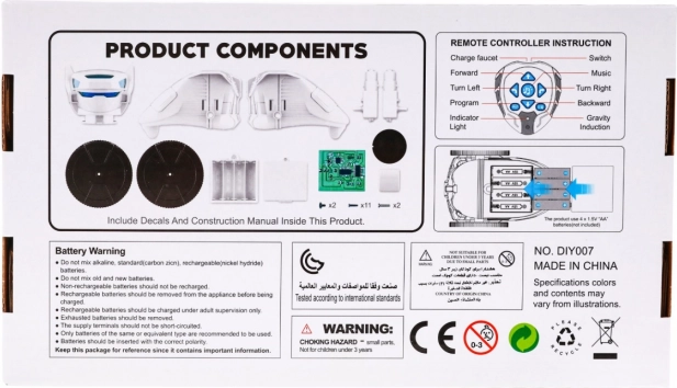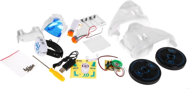 Pakken indeholder alle nødvendige dele: robotten har en størrelse på cirka 17 cm x 16 cm x 12,5 cm. En pakke på 30 cm x 17 cm x 7,5 cm indeholder også en detaljeret samlevejledning. Det er en fantastisk måde at udvikle børns færdigheder inden for elektronik og robotteknik.