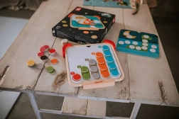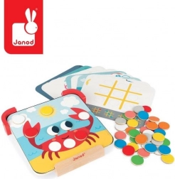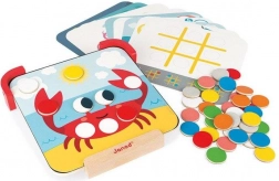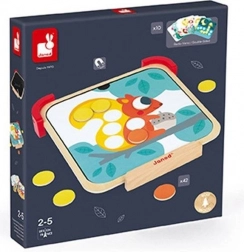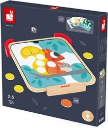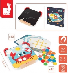 Den magnetiske læringsleg Jeg lærer farver fra JANOD tilbyder en komplet aktivitet for små opdagere. Sættet indeholder en magnetisk trætavle med sokler, 42 farvede magnetiske cirkler, 10 dobbeltsidede forlæg med opgaver og et stykke kridt. Børn placerer magneterne de rette steder efter forlæggene, træner farver, mønstre og koncentration – og kan også bruge tavlen til at tegne og tage de første skridt med bogstaver og tal.