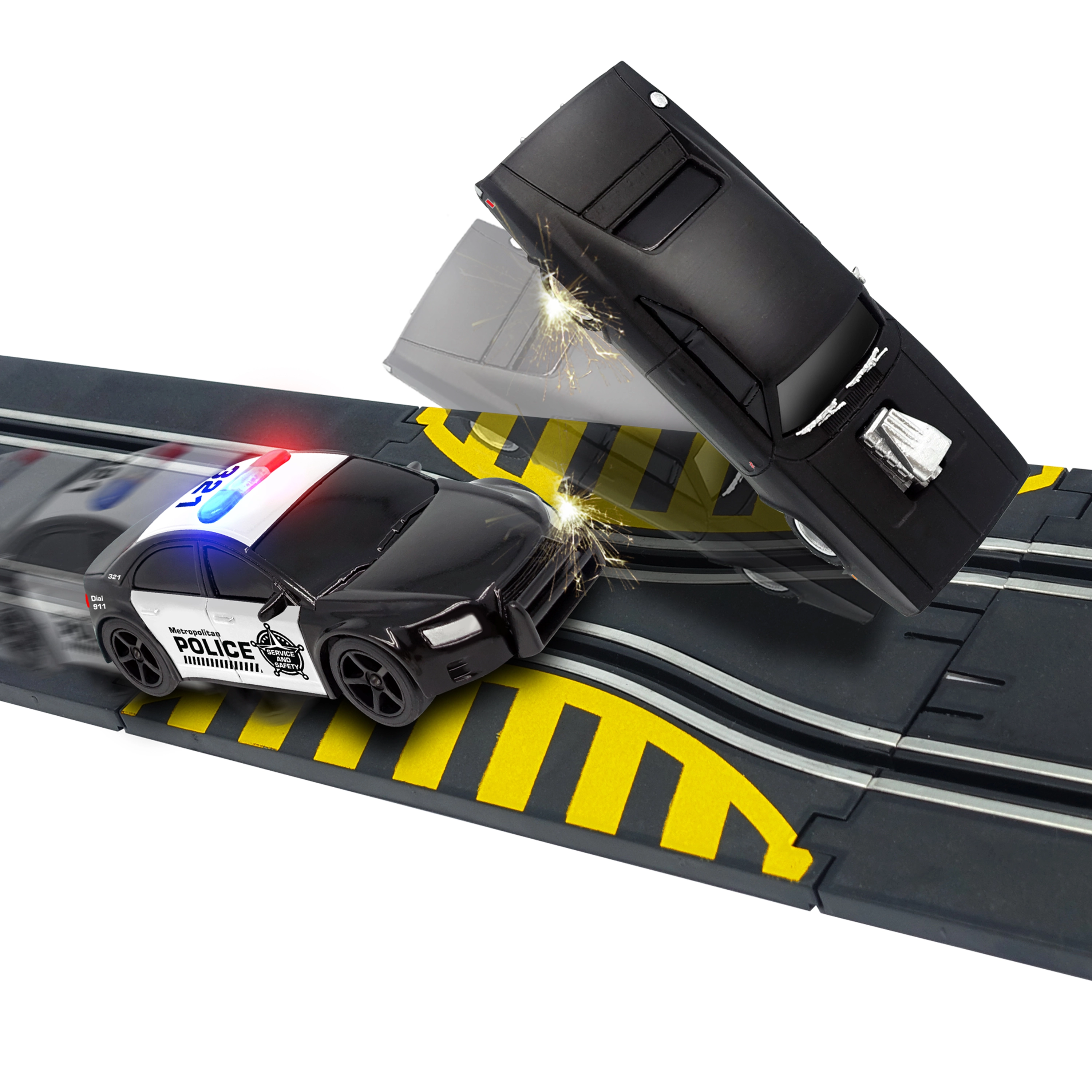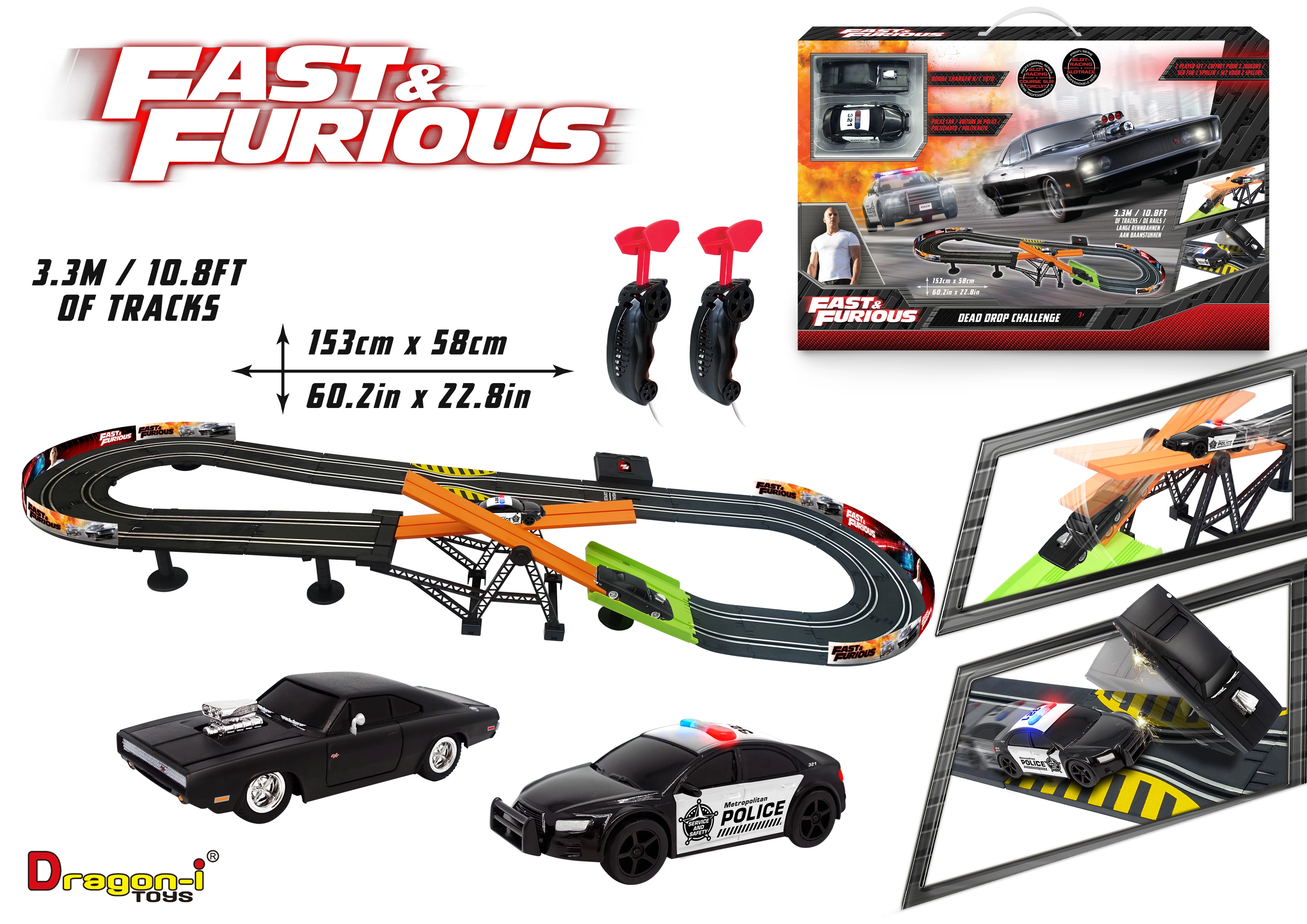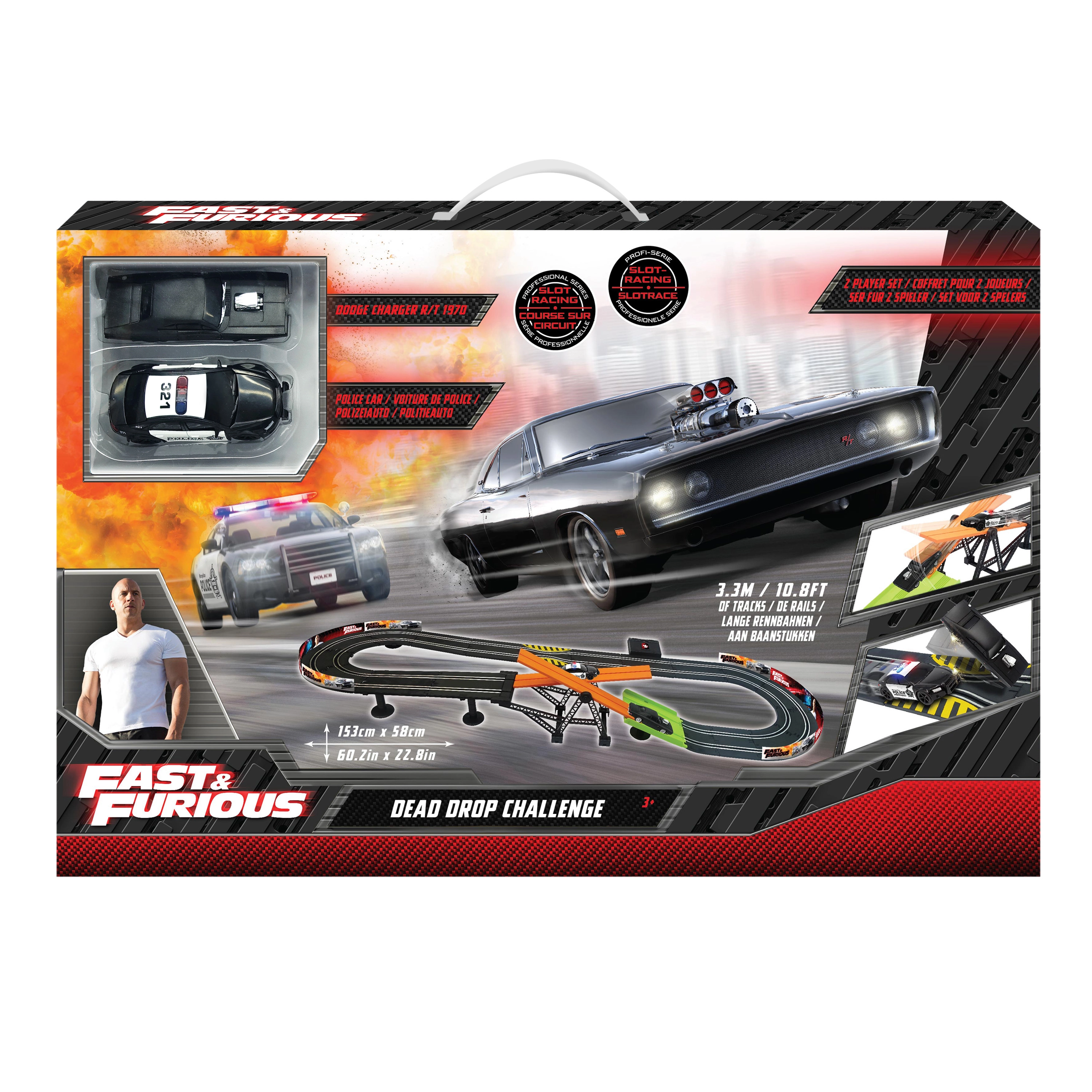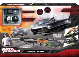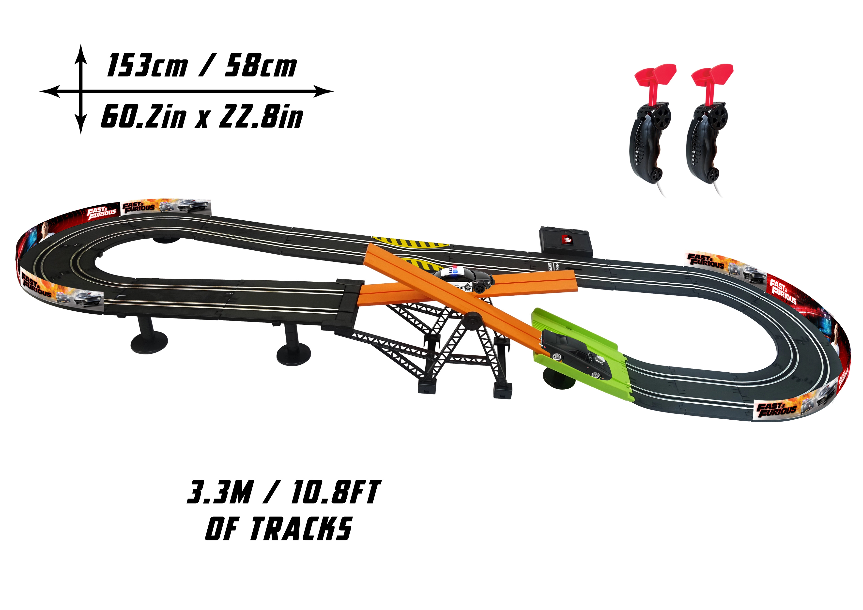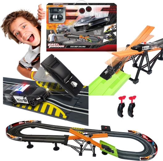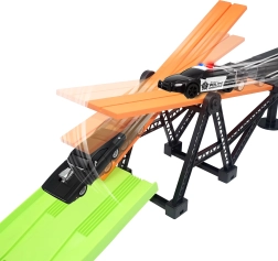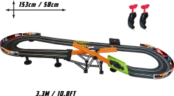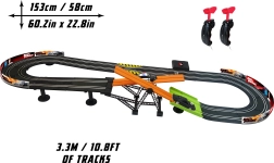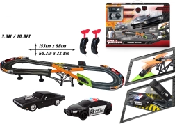 Racerbane med forhindring Hurtig og rasende. Banens længde 3,3 m. Mål 153x58 cm. 2 biler inkluderet. 6xAA batterier til batteriboksen er ikke inkluderet. Monteringsvejledning medfølger.