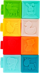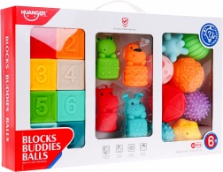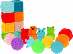 | | Sættet med bløde, sikre sensoriske legetøj er beregnet til børn fra 6 måneder. Legetøjet er fremstillet af 100% børnevenlige materialer. De stimulerer fantasi, sind, syn og hørelse. Elementerne i sættet kan barnet frit klemme på, hvilket styrker hænderne. Ved klemning afgiver de lyde, som vækker barnets interesse. Sættet består af 20 dele: Indeholder 4 dyr, 8 bolde og 8 klodser. Hvert element har en anden struktur og farve, hvilket giver barnet forskellige stimuli til sanserne. |