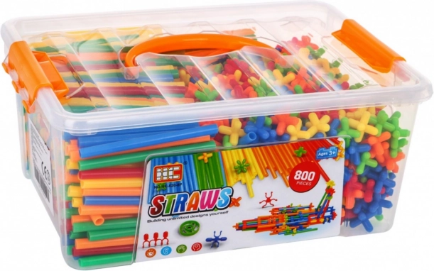 | Stort byggesæt – byggesugerør er et legetøj til børn fra 3 år. Sættet indeholder op til 800 dele, som dit barn kan bruge til at bygge mange fantastiske konstruktioner som tårne, køretøjer, broer, bygninger m.m. Pindene forbindes perfekt med hinanden ved hjælp af stik. De leveres i forskellige farver: grøn, rød, blå, orange og gul. Hele sættet er pakket i en plastkasse med bærehåndtag. Sættet indeholder også en illustreret vejledning med eksempler på konstruktioner, der kan bygges. Leg med sugerør udvikler barnets fantasi og lærer kreativ og logisk tænkning. | |