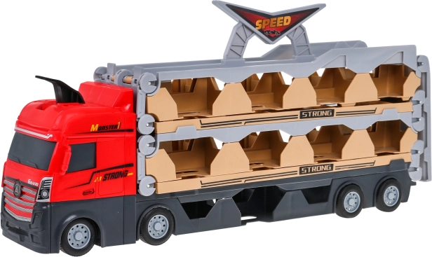 Den store lastbil med katapult giver børn uendelige legemuligheder: den fungerer som opbevaringsvogn til små biler, forvandles til en lang racerbane, når den foldes ud, og takket være den indbyggede katapult skyder den bilerne frem. Konstruktionen er stabil, plastdelene er lette, og gummihjul sikrer stille og glidende bevægelse.