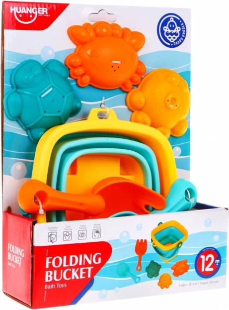 Mål | - spand i udfoldet tilstand ca. 18,5 cm x 17,5 cm x 13,5 cm, - spand i sammenfoldet tilstand ca. 19 cm x 18 cm x 4 cm, - længde på skovl og rive ca. 15 cm, - forme ca. 10 cm x 8 cm, - emballage ca. 29 cm x 22 cm x 7,5 cm. |