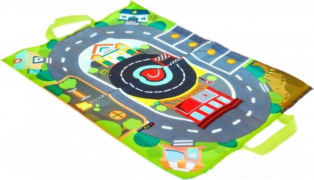 Underlaget med veje, huse og natur foldes med velcro til en praktisk taske med håndtag. Nemt at opbevare og tage med overalt.