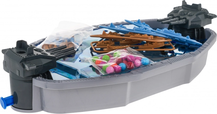 - skib med affyringsenheder, - 10 x blåt skib, - 10 x brunt skib, - 30 x farvede kugler |