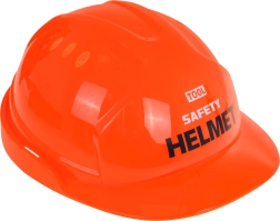 Den orange sikkerhedshjelm fuldender rollen som lille bygmester og lærer grundlæggende sikkerhed ved arbejde med værktøj.