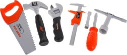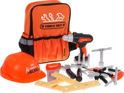 Rygsækken er lavet af slidstærkt tekstil, har hovedrum med lynlås, side- og frontlommer samt justerbare stropper for behagelig bæring. Sættet indeholder sav, hammer, skruetrækker med bits, nøgler, skruer med møtrikker og montageplader – alt i børnevenligt, let og holdbart design.