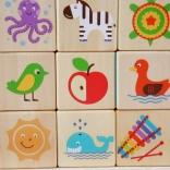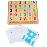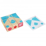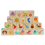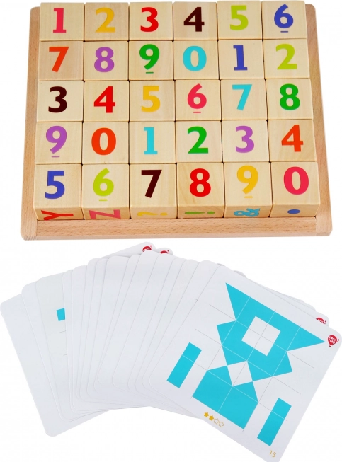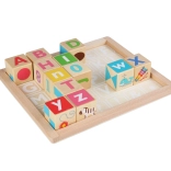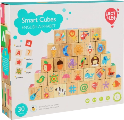 Sættet indeholder også en rammeplade med alfabetet og 15 dobbeltsidede kort med specielle mønstre. Børn kan matche terningerne til de rette steder eller skabe figurer efter skabeloner, der minder om tangram. Fremstillet af kvalitets træ og malet med ikke-giftige farver, sikrer det en sikker og sjov leg.