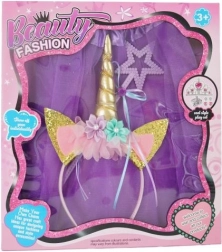 Den behagelige hårbøjle sidder sikkert og glider ikke. Den er pyntet med et gyldent horn, glitrende ører og farverige blomster – det perfekte tilbehør til et magisk look.