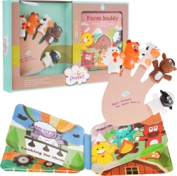 Underholdende sæt til børn fra 3 år: 5 gummi-fingerdukker (høne, hund, æsel, ko, lam) og en blød vandtæt bog med pivelyd. Ideelt til dukketeater, udvikling af fantasi og finmotorik. Sikker udførelse uden skarpe kanter, teksterne i bogen er på engelsk.