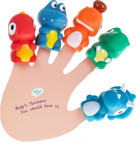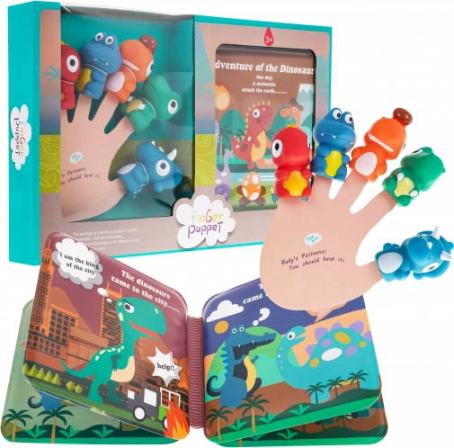 Sæt med 5 gummi fingerdukker dinosaurer med blød bog, 3+, vandtæt