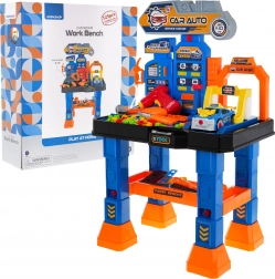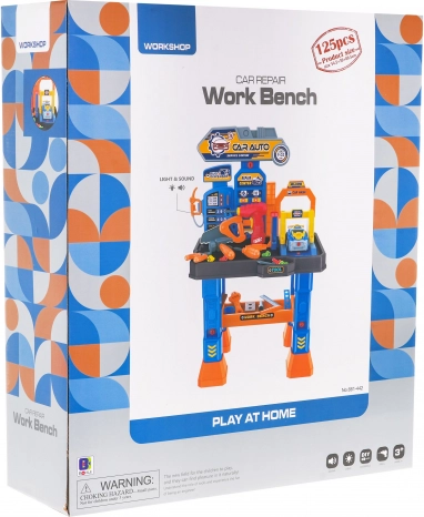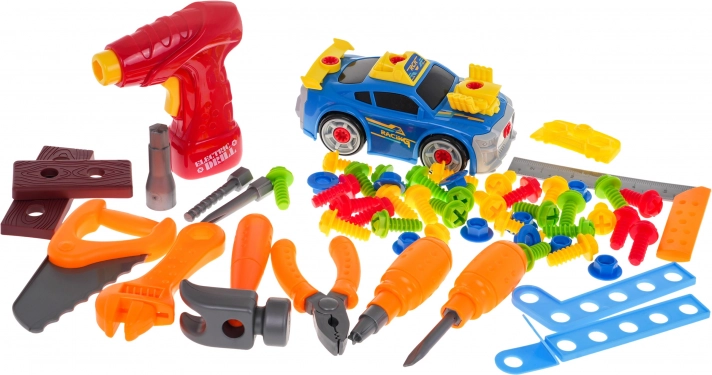 Sættet indeholder 125 dele af tilbehør: værktøj (hammer, sav, tang, nøgler), batteridrevet skruemaskine, skruer, bits, hoveder samt dekorative klistermærker. Den lille bil kan skilles ad og tilpasses, hvilket understøtter teknisk tænkning og hånd-øje-koordination. Det stabile arbejdsbord er let at samle og ideelt til leg derhjemme.