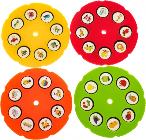 Fire farvede skiver tilbyder 8 motiver hver – fra dyr og frugter til køretøjer. Børn lærer former og farver, mens de træner tegning på en sjov måde.