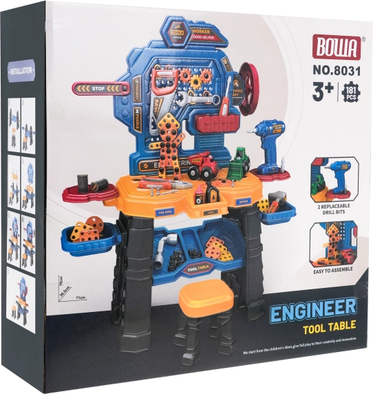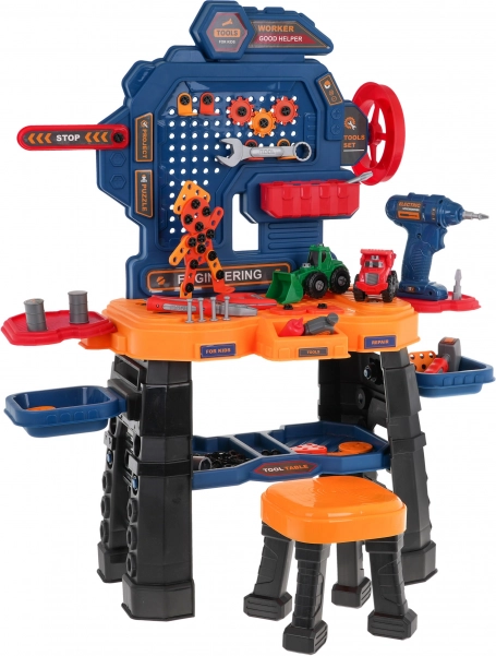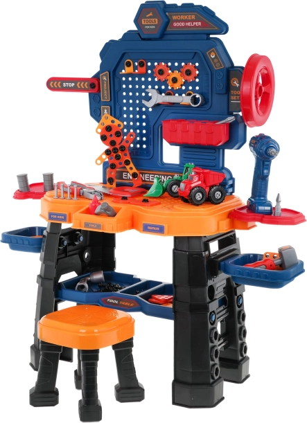 Dette farverige værkstedsæt forvandler børneværelset til et rigtigt mini-værksted. Det robuste arbejdsbord med hylder og organizer suppleres af en komfortabel skammel og en batteridrevet akku-boremaskine (2× AA, medfølger ikke). Børn kan skrue, bore og samle deres egne projekter, inklusive to byggemaskiner – en læssemaskine og en tipvogn.