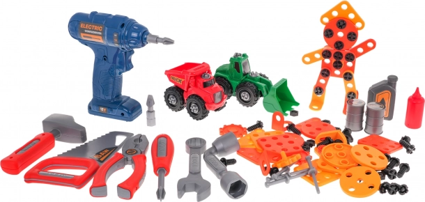 Sættet indeholder et bredt udvalg af værktøj: boremaskine med bits, sav, hammer, skruetrækker, nøgler, tænger, dusinvis af skruer, rawlplugs og skiver samt tandhjul til den første introduktion til mekanik. Takket være de mange dele og formpaneler træner børn tålmodighed, logik og koordination.