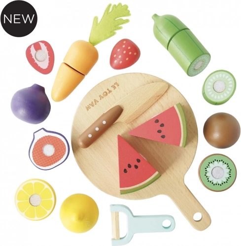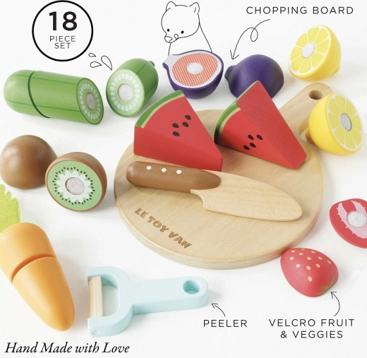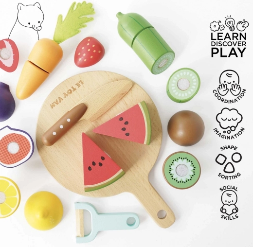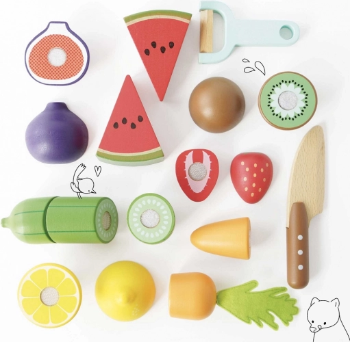 Dette kvalitetssæt til små kokke giver realistisk leg fuld af fantasi. Det indeholder et naturligt træskærebræt, en skræller, en kniv og et udvalg af lækre “fødevarer”, der let kan “skæres” og samles igen ved hjælp af velcro. Ideelt til udvikling af koordinationsevner, finmotorik og rolleleg.