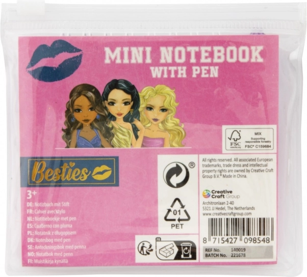 Denne mini-notesblok er perfekt til alle små forfattere og tegneglade. Med Besties-motiver vil børn være begejstrede for at kunne nedskrive deres tanker eller tegne deres egne billeder. Takket være det kompakte mål 8×8 cm og det gennemsigtige etui, der beskytter blok og blyant, passer den nemt i rygsæk eller skoletaske.
