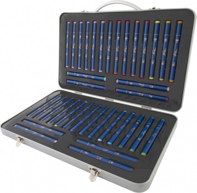 Professionelt sæt til kreativ skaben: 36 stk kvalitets dobbeltsidede tuscher med to spidser placeret i en praktisk metalkuffert for sikker transport og overskuelig organisering.