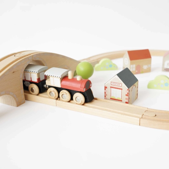 Dette jernbanesæt er det perfekte værktøj til at fremme fantasifuld leg hos små børn. Det er lavet af træ af høj kvalitet med FSC-certificering, hvilket garanterer, at det er miljøvenligt. Sættet inkluderer: