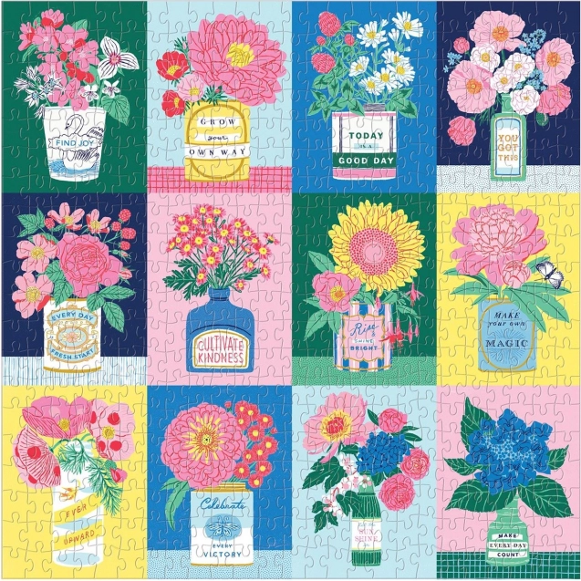 Tolv blomsterkompositioner med motiverende tekster bringer både optimisme og farver til puslespillet.