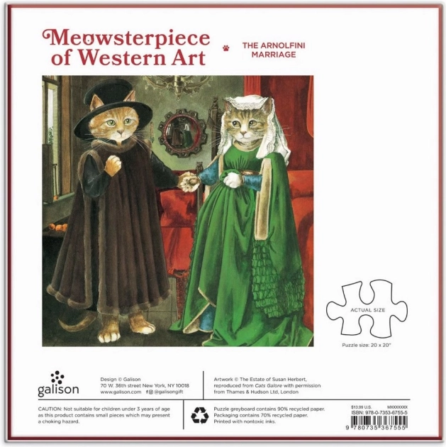 Nyd hyggelig fordybelse med et originalt motiv af kattekunstneren Susan Herbert – en parodi på Van Eycks ikoniske værk. Dette kvalitets puslespil i kvadratisk format med 500 brikker fra Galison begejstrer både kunst- og katteelskere og måler ca. 51 × 51 cm, så det er behageligt at lægge. Et glimrende valg til afslapning eller som gave til alle, der sætter pris på humor, elegance og præcist håndværk.