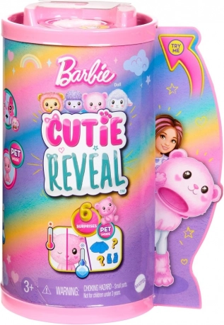 Oplev en verden af overraskelser med dukken BARBIE Chelsea Cutie Reveal i et sødt bamsekostume. Der venter dig 6 overraskelser, et blødt kostume, outfit-forvandling og et kæledyr med magisk vandaktiveret udseendeskift – den perfekte gave til børn fra 3 år.