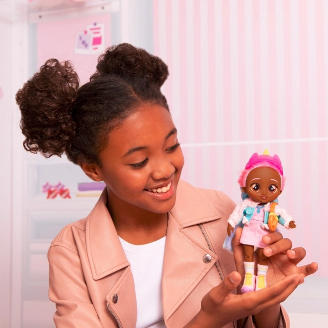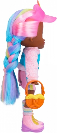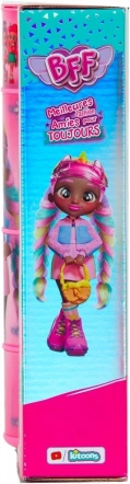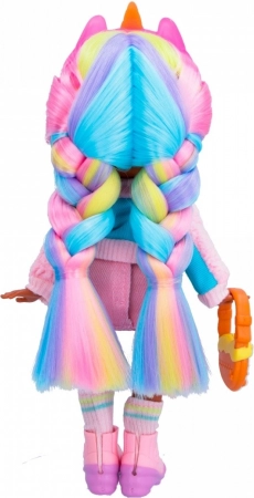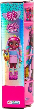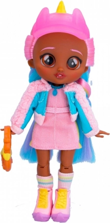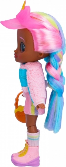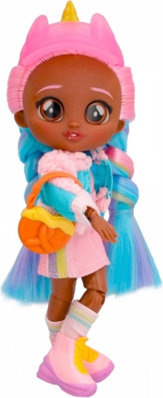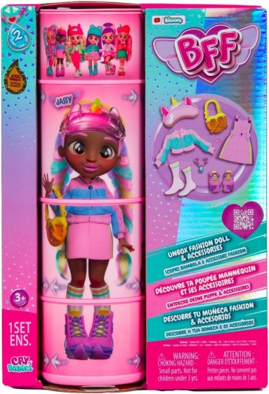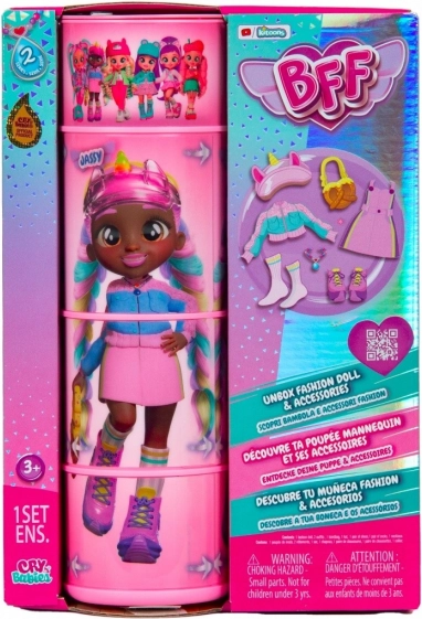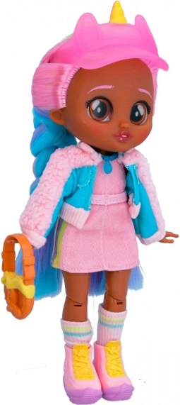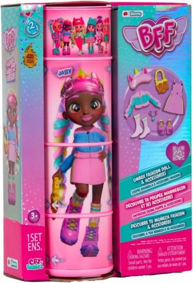 Jassy med stilfuldt regnbuefarvet hår, glasøjne og 6 bevægelige led er klar til ethvert eventyr! Hun har moderigtigt tøj på, som fuldendes af en yndig hat med et enhjørningehorn! Hun har en sporty pink-blå jakke, en sød lyserød nederdel og matchende sneakers på! Glem ikke også at tilføje en håndtaske formet som en pretzel og et BFF-halskæde!