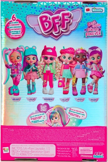 Det er yderligere 6 Cry Babies Magic Tears-dukker, som er blevet ældre og nu er teenagere! Ella, Lala, Daisy, Bruny, Hannah og Jassy! De er blevet teenagere og oplever alle mulige eventyr sammen. De bærer moderigtigt tøj, har lange nylonhår, der er ideelle til styling, glasøjne og bevægelige dele! Pak din BFFs garderobe ud og opdag mere end 9 overraskelser:
