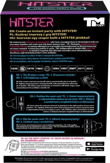 Hitster er et partyspil, der forvandler enhver stund til uforglemmelig underholdning. Med hjælp fra den gratis app og dit DJ-instinkt afslører I, hvem af jeres venner der husker flest musikfakta og kan skabe den perfekte tidslinje af sange: