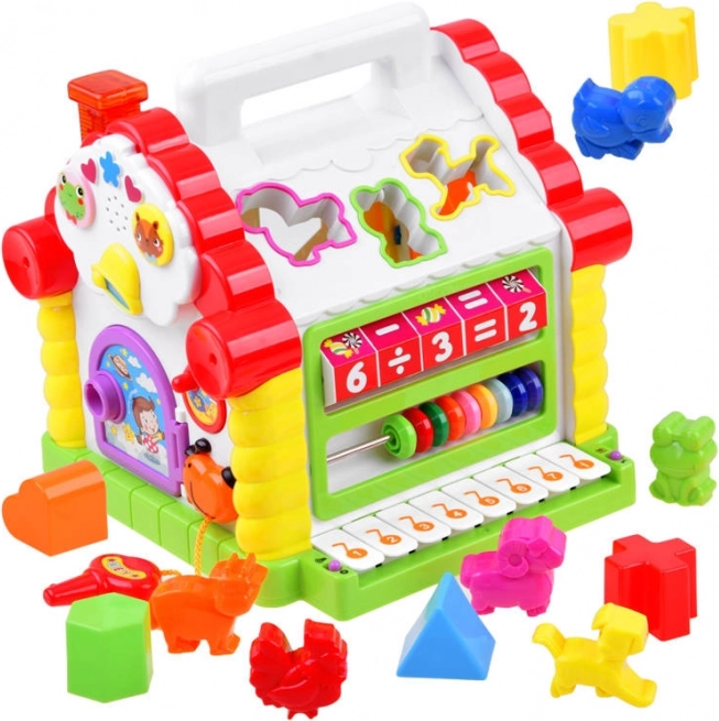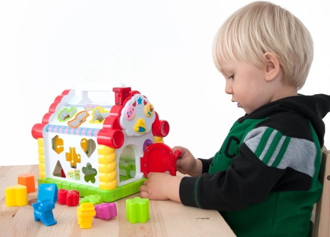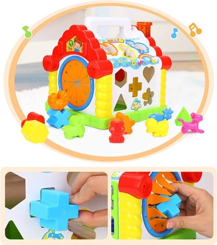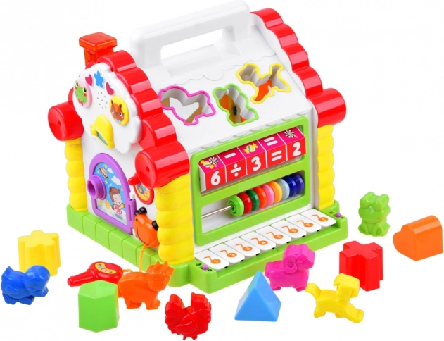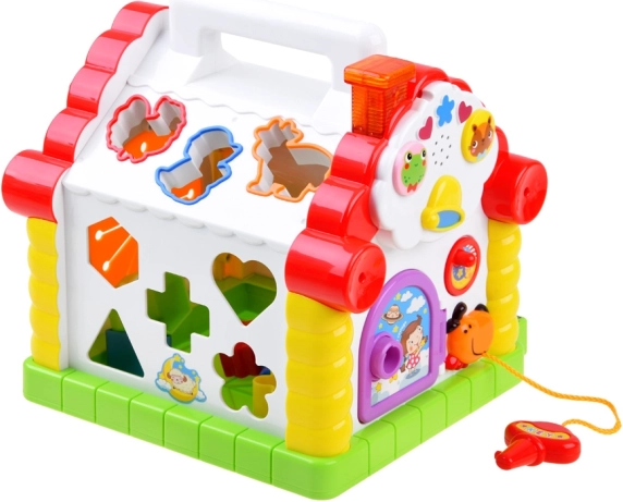 Huset gør det muligt for børnene at indsætte forskellige former og dyr i de rigtige åbninger, hvilket stimulerer deres finmotorik og forståelse af former og lyde.