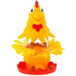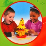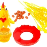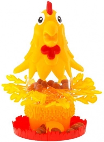 Placer reden på basen, sæt den gennemsigtige kyllingekrop med hoved på, indsæt fjer i hullerne og fyld maven med æg. Pluk derefter forsigtigt fjerene, og hold æggene i reden så længe som muligt. Spillet går med uret og byder på spænding i hvert træk.