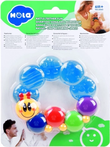 Den søde HOLA-bidering formet som en larve er designet i holdbare og sikre materialer til daglig brug. Takket være den lette konstruktion og smarte form kan barnet nemt gribe den og flytte den fra hånd til hånd. De teksturerede segmenter massérer skånsomt de sensitive gummer og hjælper med at berolige ubehag under fremkomsten af de første tænder.