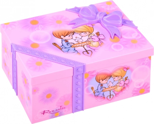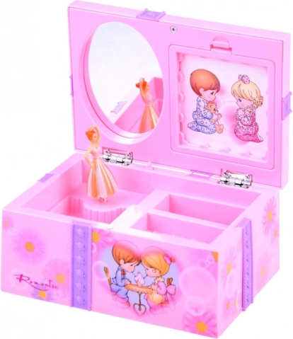 Dette charmerende smykkeskrin i rosa toner er dekoreret med blomster og søde illustrationer af en pige og en dreng. Når låget åbnes, drejer ballerinaen rundt, og en behagelig melodi skaber en eventyrlig atmosfære ved den daglige pyntning og opbevaring af smykker.