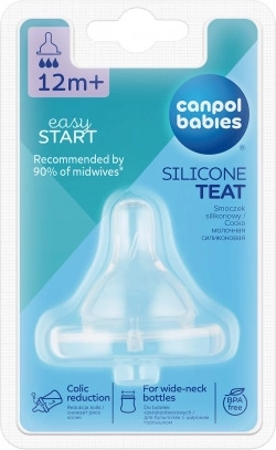 Canpol Babies sut med bred hals er lavet af kvalitetssilikone, som er smags- og lugtfri, hvilket ikke ændrer smagen af maden. Formen og materialet efterligner moderens naturlige brystvorte, hvilket muliggør en nem overgang mellem amning og flaskefodring.