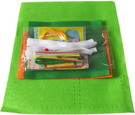 Sættet indeholder farverige tekstildele, pynt, bånd samt en stor plastnål. Børn kan begynde at skabe med det samme uden ekstra køb.