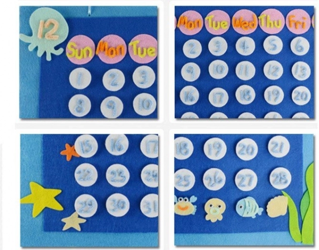 - Farvede materialer, markeringer til ugedage og datoer, velcro, dekorative tråde, bånd, flerfarvede pynt i forskellige former og størrelser, stor plastnål