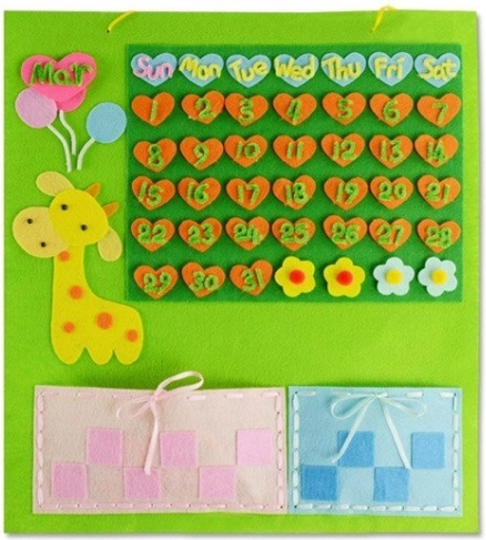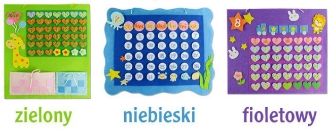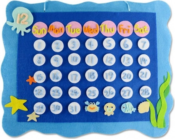 Lav din egen vægkalender i filt – en sjov og lærerig aktivitet for børn. Sættet indeholder alt, hvad der er nødvendigt for at skabe og lære ugedage, tal og tidsplanlægning. Understøtter finmotorik, kreativitet og øje–hånd-koordination.