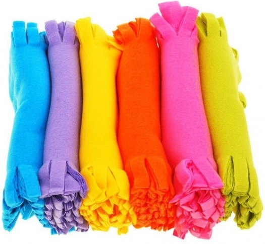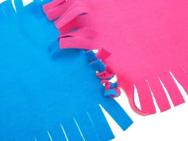 Hver del har forberedte frynser – kvadraterne knyttes blot sammen, og tæppet er færdigt uden nål og tråd. Ideelt også for begyndere.