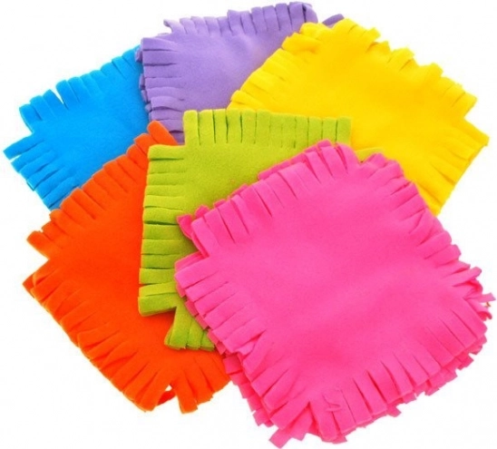 DIY-sættet “Gør det selv” til fremstilling af et patchwork-fleecetæppe er ideelt for alle små skabere. Hvert kvadrat i blødt fleece måler cirka 23 × 23 cm, og når frynserne knyttes sammen, får du et behageligt, varmt og legende farverigt tæppe.