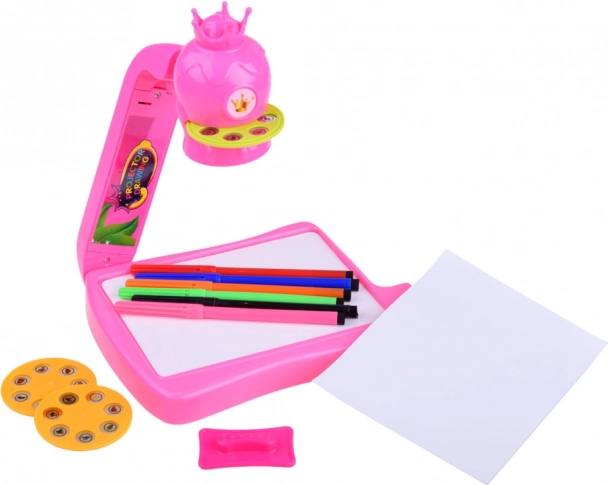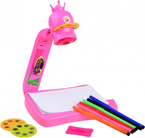 Slip barnets fantasi løs med denne lyserøde tegneprojektor med krone. Takket være projicerede skabeloner og et sæt tuscher kan små kunstnere let lære at tegne af og skabe egne værker. Sættet indeholder 3 mønstreskiver, 6 farvede tuscher, tegnehæfte og en kompakt, sammenklappelig konstruktion for nem opbevaring.